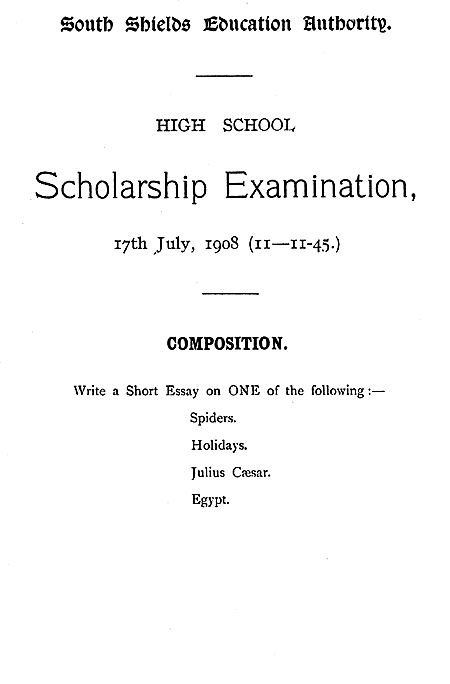 If you were 11 years old and hoping to get a free scholarship to the Boys' High School for the year beginning in September, 1908, you would have turned up at the High School on the morning of Saturday, 17th July, 1908, and have taken five of six examination papers. The links below will take you to the papers - have a look - how well would you do? 11:00 to 11:45 Composition lunch then either ... 15:05 to 16:10 Geography